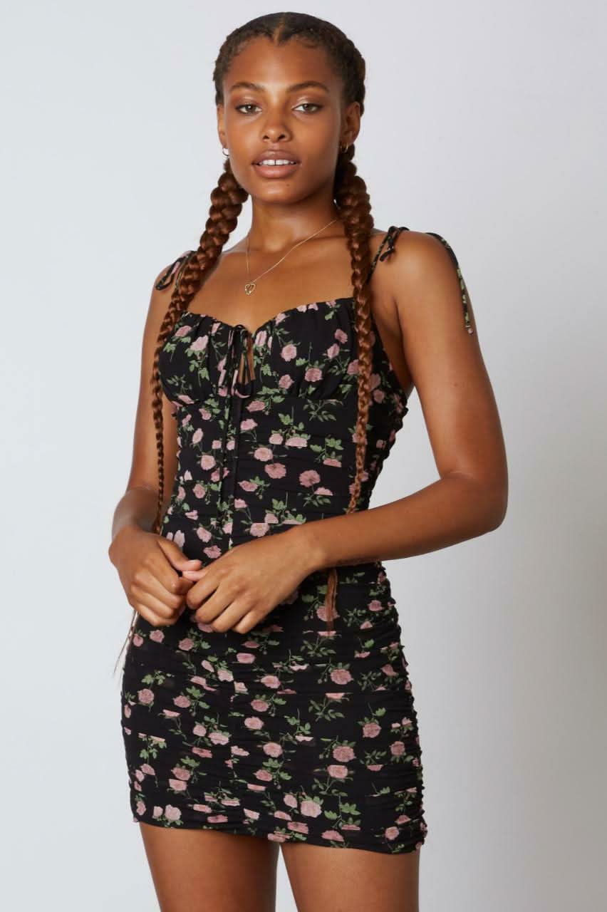 The Angie Black Floral Ruched Bodycon Dress is all you need for a perfect day! Lightweight black floral ruched fabric (in pink and green hues) shapes this curve-hugging dress with self-tie straps, a fitted bodice, a sweetheart neckline with tie, and ruffle trim. A high, fitted waist sits above a body-conscious mini skirt.