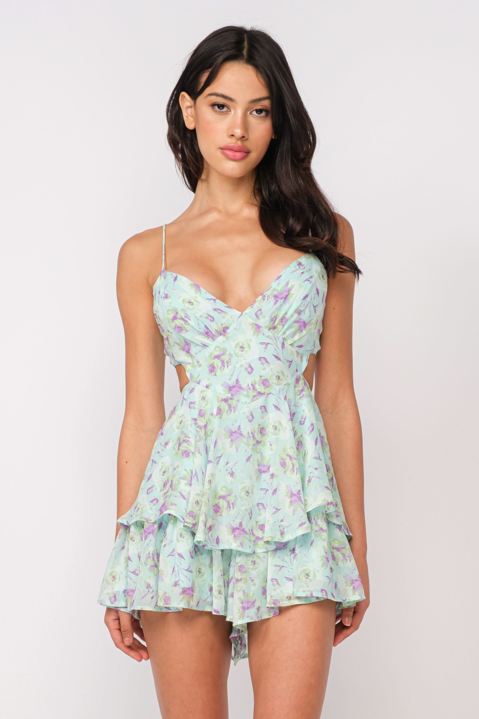 The Aristea Mint Floral Cutout Romper Dress is the perfect number for a night out on the town! Mint floral watercolor print fabric shapes this romper dress with a V-neckline, a fitted bodice, and a crisis cross tie-back with adjustable straps. Features a cutout waist and a tiered ruffle hem over hidden shorts.