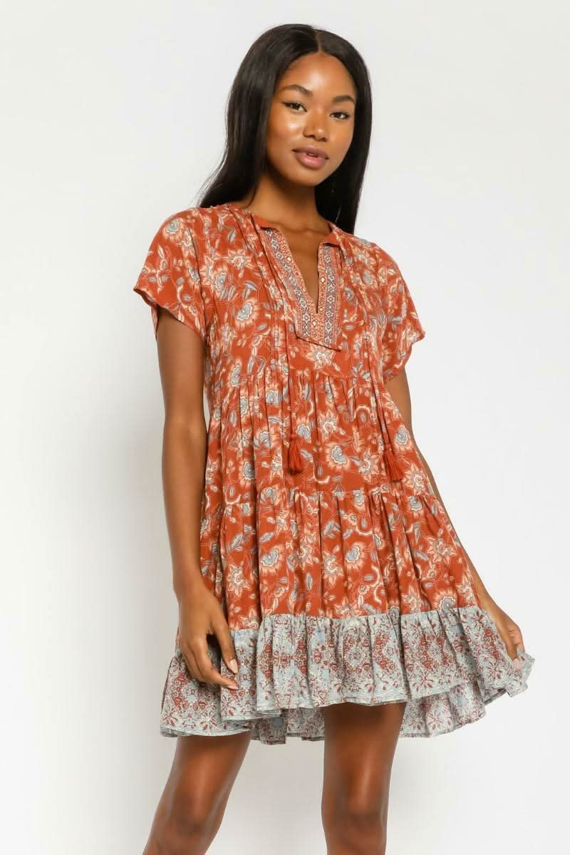 Start the day in the Dulce Rust Floral Print Mini Dress, for a delectably sweet day! Lightweight rayon fabric, in a reddish rust, teal, and ivory floral print, shapes this cute tiered mini dress. V-neckline with teal tassel tip tie at neckline, empire waist bodice, short sleeves and attached tiered ruffle skirt.