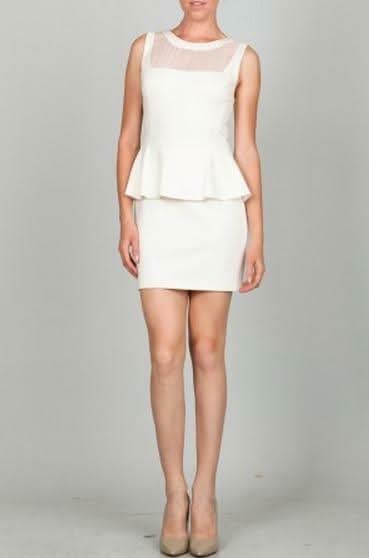 Create a look that's totally ladylike with the Eva White Peplum Mini Dress! Medium-weight stretch knit, in a soft off white hue, shapes this structured dress with a chiffon trim rounded neckline and back, sleeveless bodice. Matching skirt with attached flaring peplum hem finishes the look.