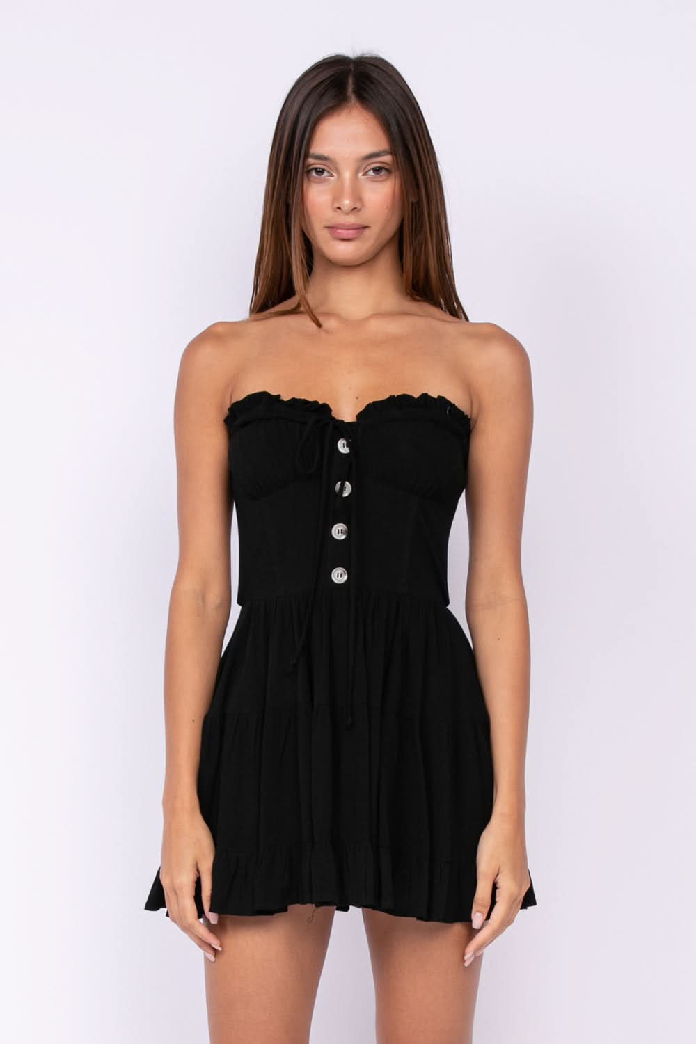 The Garden Charm Black Strapless Dress is the dress you need in your closet! This eye-catching black strapless mini dress is super flattering with its strapless bustier bodice with self-tie and a sweetheart neckline (and hidden no-slip strips), and corset-inspired seaming. Flattering fitted waist tops a flaring ruffle mini skirt. Partially lined.