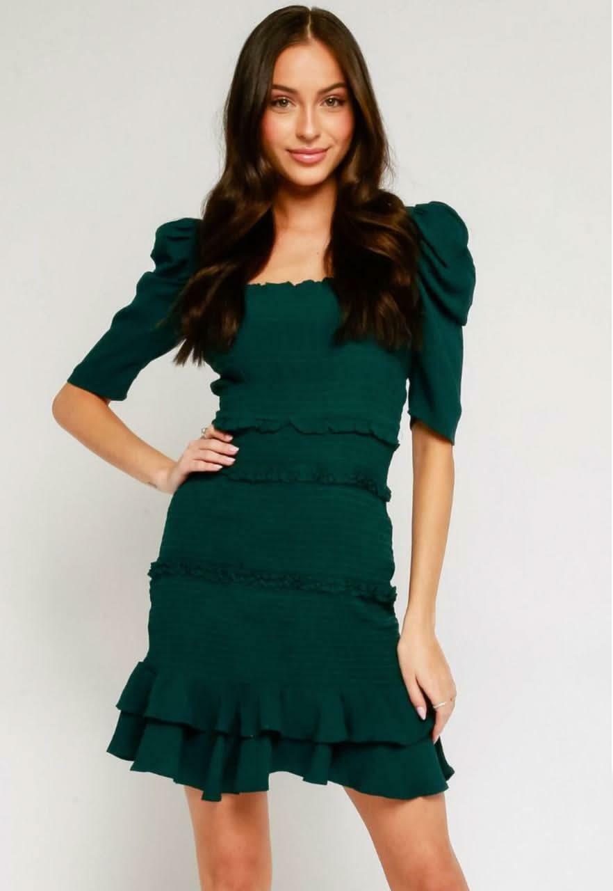 Steal the spotlight in the Naomi Green Smocked Puff Sleeve Mini Dress! Smocked, amazon green woven fabric forms this cute bodycon mini dress. Dynasty era, statement-making puff sleeves, a square neckline, and ruffle hem give this dress plenty of chic attitude.
