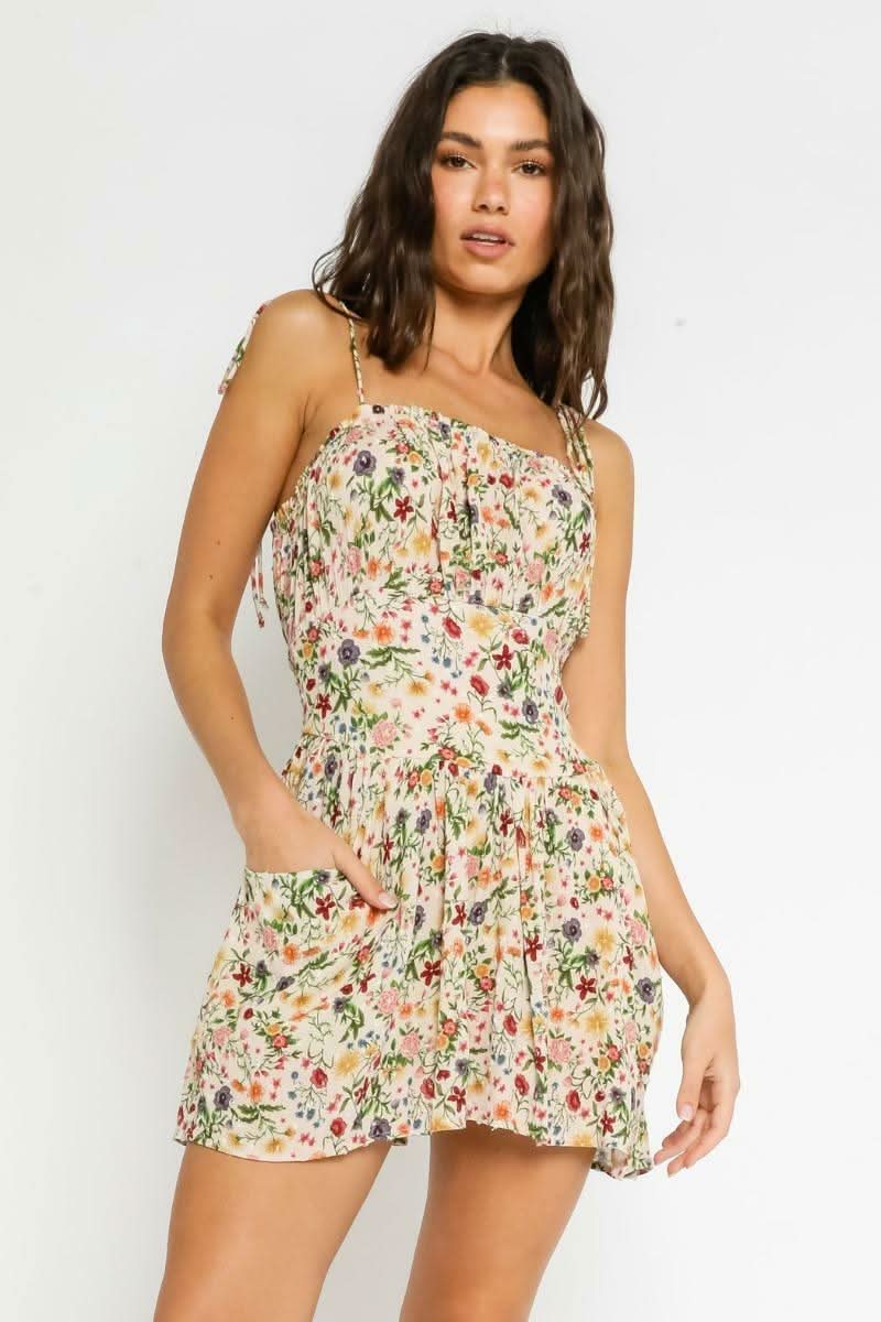 Get excited because the Riley Poppy Fields Floral Print Mini Dress is summer sweetness! Floral woven fabric (a cream, blush, lavender, yellow, green, plum, and purple floral print) forms a square neckline with attached self tie straps. Fitted waist and matching mini skirt with patch pockets finishes the look.