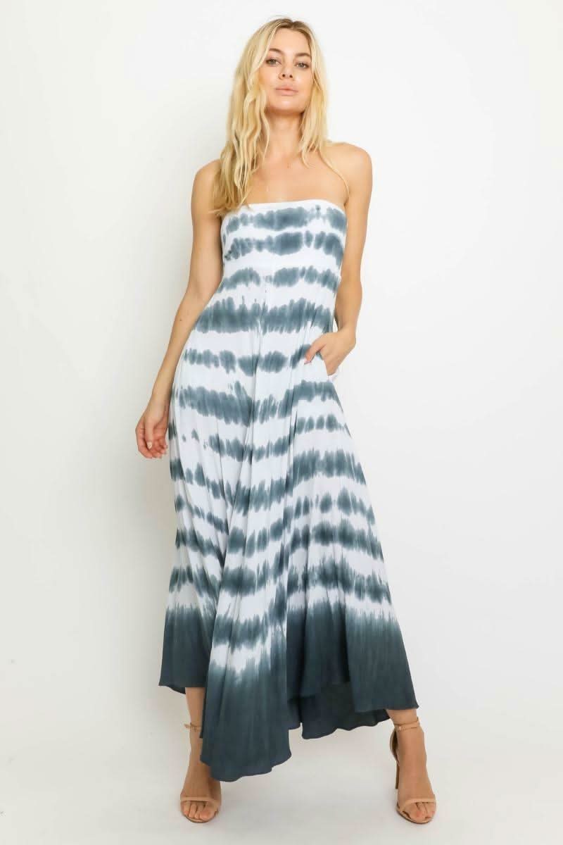 Wherever you go in the Sunshine Will Follow Charcoal Border Tie-Dye Strapless Maxi Dress, you'll be picture perfect! Medium weight woven fabric (in an allover white and charcoal grey tie-dye print) shapes this cute and trendy maxi with an elasticized, strapless neckline. A relaxed bodice atop a high waist falls to a flowy maxi skirt with an angled hemline. Smocked back, and hidden zipper/clasp closure.