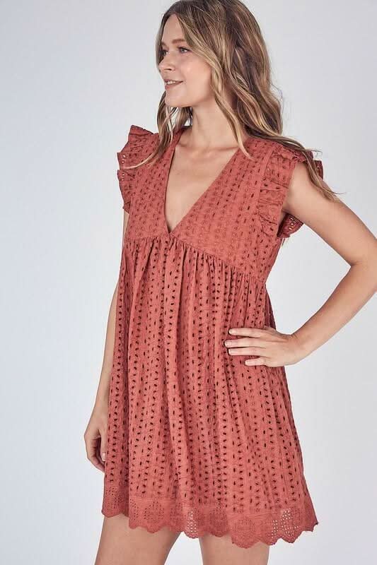 Show 'em your delicate side in the Sweet Caroline Rust Eyelet Romper Dress! Embroidered floral eyelet lace fabric, in a rust hue, shapes a V-neckline, ruffle cap sleeves, and side pockets. A flattering high waist creates a cute babydoll silhouette, while an attached A-line mini skirt hides attached shorts. Keyhole back with hook and eye closure. Lined.
